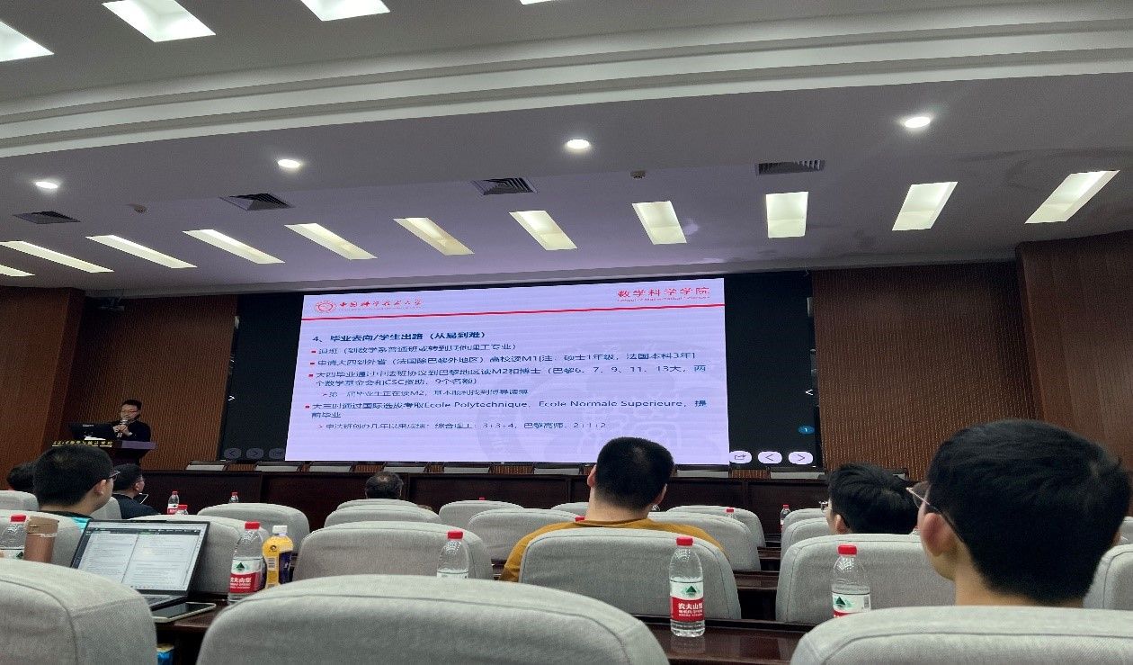 中国科学技术大学数学科学学院梁永祺教授介绍了中科大中法数学英才班创办背景、招生条件、教学课程设置、毕业去向等情况。巴黎西岱大学教授、中科大国际访问教授Loic Merel结合自身科研经历和英才班教学经验,分享他对中法数学英才班教学目标的设定和教学规划。