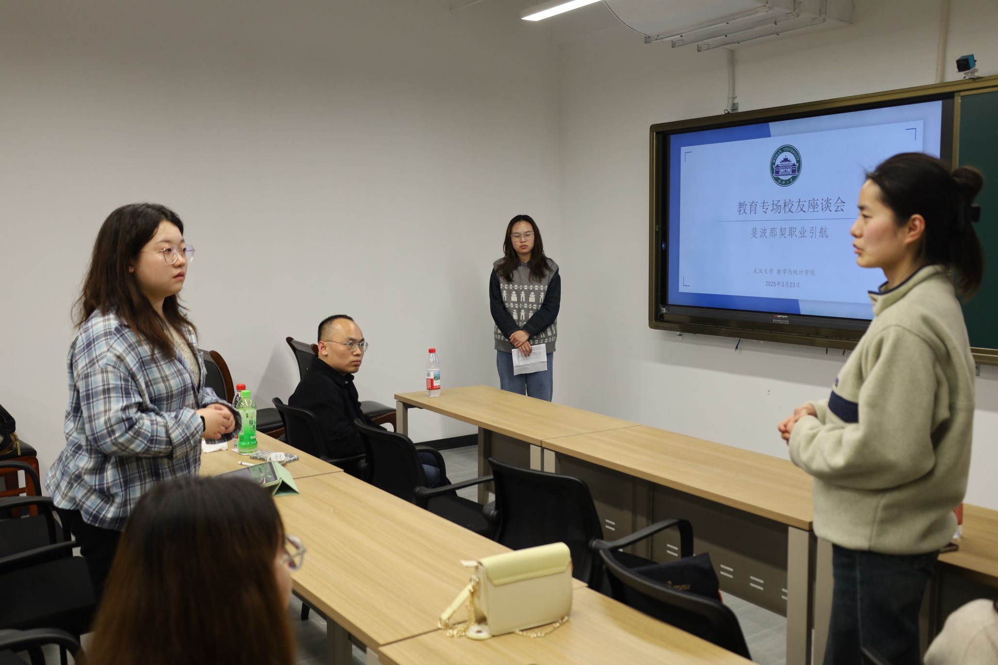 在互动答疑环节,同学们积极提问,三位校友结合自己的实际经验,耐心解答了同学们关于教师岗人才引进、教师的职业成长路线以及竞赛教师的工作时间等问题。
