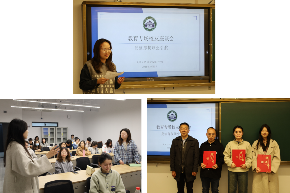 附属中学贾苏琪和武汉一中陆依然三位校友回校分享教育行业求职经验。院党委副书记汪思明为三位校友颁发“学生职业导航师”聘书,聘任其为研究生职业导师。此次座谈会为“国优计划”研究生提供与教育行业校友交流机会,助力学生明确职业规划,鼓励投身教育事业。