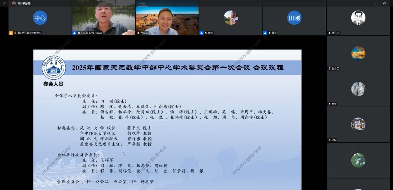 4�8日,国家天元数学中部中心(以下简称中心)新一届学术委员会首次会议以线上形式举行。会议由中国科学院院士、中心学术委员会主任田刚主持。会议邀请中国科学院院士、武汉大学校长张平文、国家自然科学基金委天元项目主任严夺魁出席。来自北京大学、南开大学、浙江大学、中国科学技术大学、中国科学院数学与系统科学研究院、吉林大学、山东大学、湘潭大学、北京师范大学、复旦大学、河北师范大学、湖北大学、华中科技大学、华中师范大学、南京大学、四川大学、天津大学、武汉大学、西南财经大学、郑州大学等单位的中心学术委员会、执行委员会及管理委员会成员参加会议�