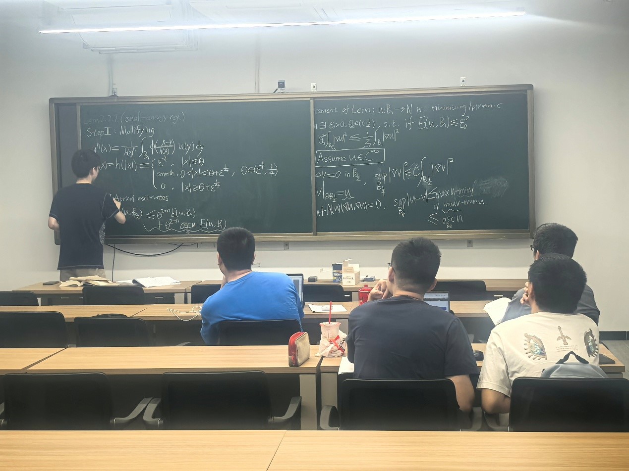 第二次讨论班则由2022级数学与应用数学(自强班)的朱锐和陈一鸣同学共同主讲。他们将内容聚焦于能量最小调和映照的正则性与奇点集,系统学习了能量最小调和映照的正则性理论,包括二维光滑性(Morrey 1948年的经典结果)和高维部分正则性(Schoen-Uhlenbeck理论),并深入研究了一般维数能量最小调和映照的奇点集维数估计和紧性定理。通过对这些前沿理论的深入学习,同学们不仅掌握了调和映照研究的核心方法,也切身体会到了现代几何分析的独特魅力与蓬勃生命力。