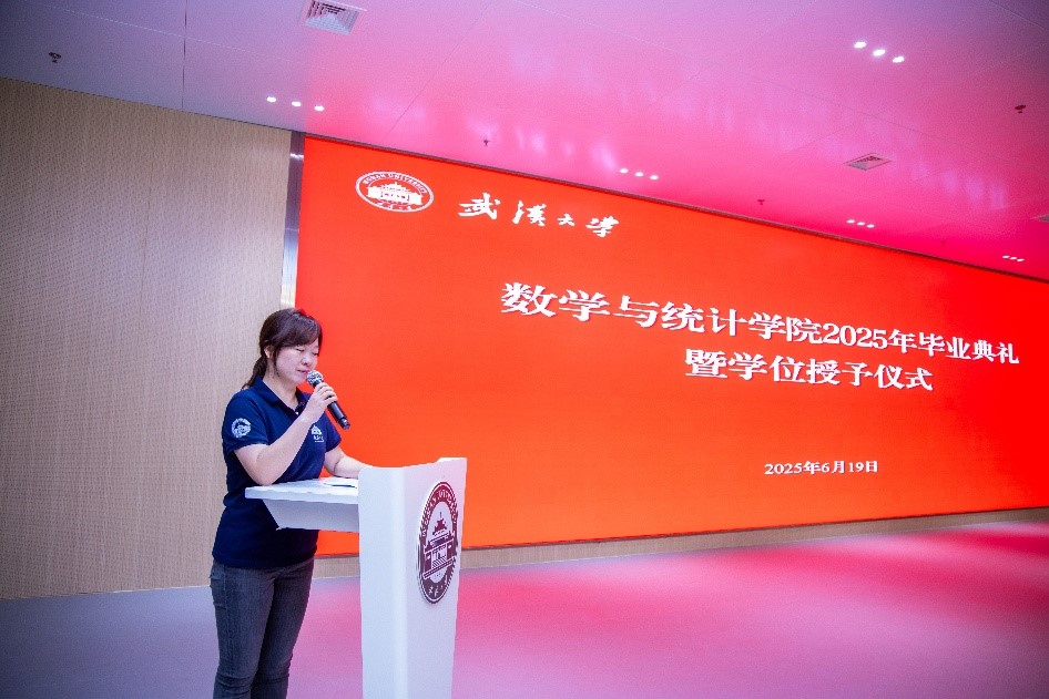 歌曲联唱后,典礼正式开始。在场师生全体起立,奏唱中华人民共和国国歌。随后,学院党委书记李勤代表学院致辞。他首先�361名圆满完成学业的2025届本硕博毕业生表示热烈祝贺,李勤书记深情回顾了同学们从樱顶老楼到雷军科技楼的奋斗足迹,肯定了同学们在校期间取得的各项成就。面对数智时代的浪潮,李勤书记向全体毕业生提出三点殷切期望:一要秉持终身学习理念,勇做与时俱进的“求知者”,在知识高速迭代的时代保持好奇与探索精神;二要坚持理论联系实际,甘为脚踏实地的“践行者”,将数学与统计的学科价值用于解决实际问题;三要涵养深厚家国情怀,争做为国为民的“奉献者”,在科技强国建设的征程中贡献智慧与力量�