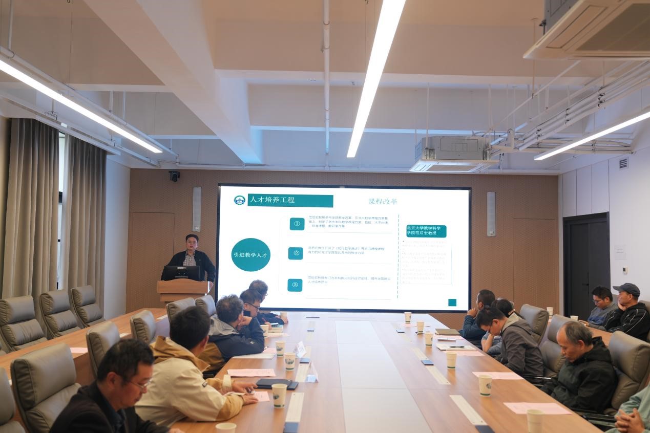 在本科教学改革方面的积极探索和实质性进展。他结合北京大学数学科学学院在课程设置、拔尖人才培养等方面的先进经验,对改革方面提出了宝贵的建设性意见。此外,围绕大类平台课建设、荣誉课程体系、本科生科研能力提升、本研贯通等,冯教授和参会教师进行深入交流探讨。