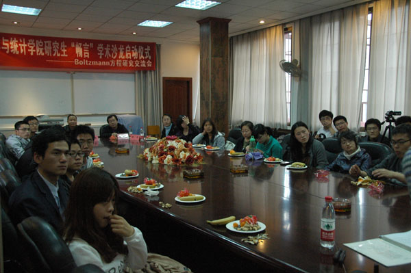 启动仪式结束后是研讨会部分。王涛同学从容走上讲台开始了他幽默风趣却又不失学术严肃性的报告,鉴于在座的大部分听众对于Boltzmann方程并不熟悉,王涛并不局限于方程的细节,而是从方程本身的发展历史、意义及近期学术界对Boltzmann方程所做的研究等方面做一些宏观的介绍,现场气氛热烈而轻松。面对冯慧副院长和吕锡亮老师有针对性的提问,王涛则应答自如,同学们也从王涛的解答中对Boltzmann方程有了更深入的了解。一个多小时的报告虽然很结束了,但给在场的研究生留下了深刻的印象,也从中受到了许多启发。