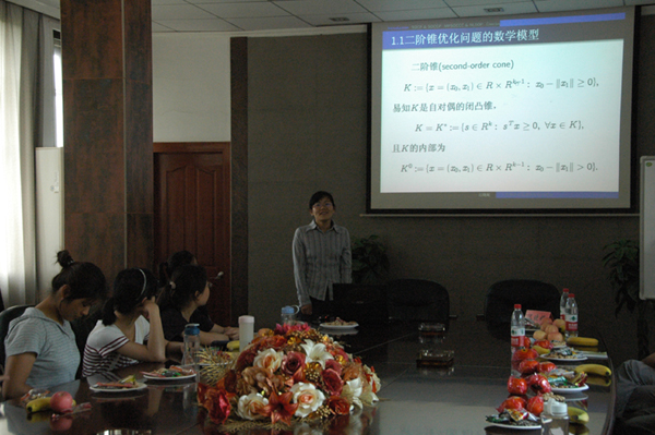 在主持人的开场白后,活动正式拉开了序幕。首先,迟晓妮博士后对二阶锥的背景、基本概念、研究方法,结论等做了详细的描述,并总结和展望了该方向的工作。同学们一边倾听着迟晓妮博士后的精彩报告,一边品尝着学术沙龙提供的精致小食,在轻松愉快的氛围中进行思维的碰撞。然后,同学们进行了交流讨论,对有疑问和感兴趣的方面提出了自己的想法。迟晓妮博士后也一一详细地作了回答。