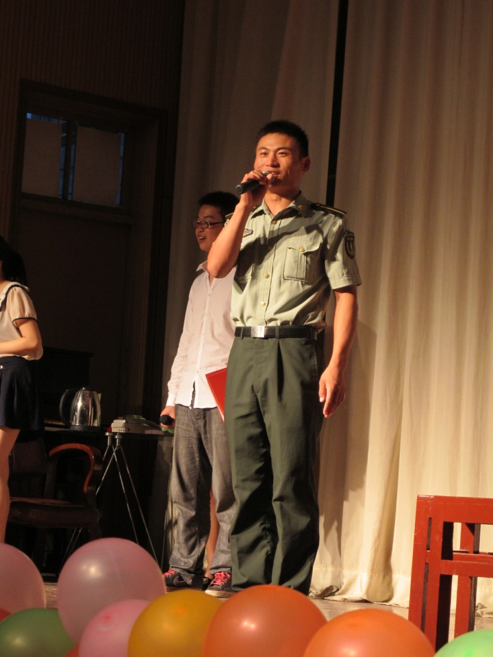 在本科生数类二班杨宁同学的《Never Say Never》、研究生应用数学班徐国茂、胡鹏的《兄弟》等精彩表演之后迎来了本次联欢会的第一个高潮——一直倍受新生期待的数院学生会大主席李绎楠终于一展歌喉,送上了歌曲《断点》。之后的中场休息是抢凳子游戏,老师、同学以及到场的教官们都踊跃参加,主办方还带来了神秘礼品。