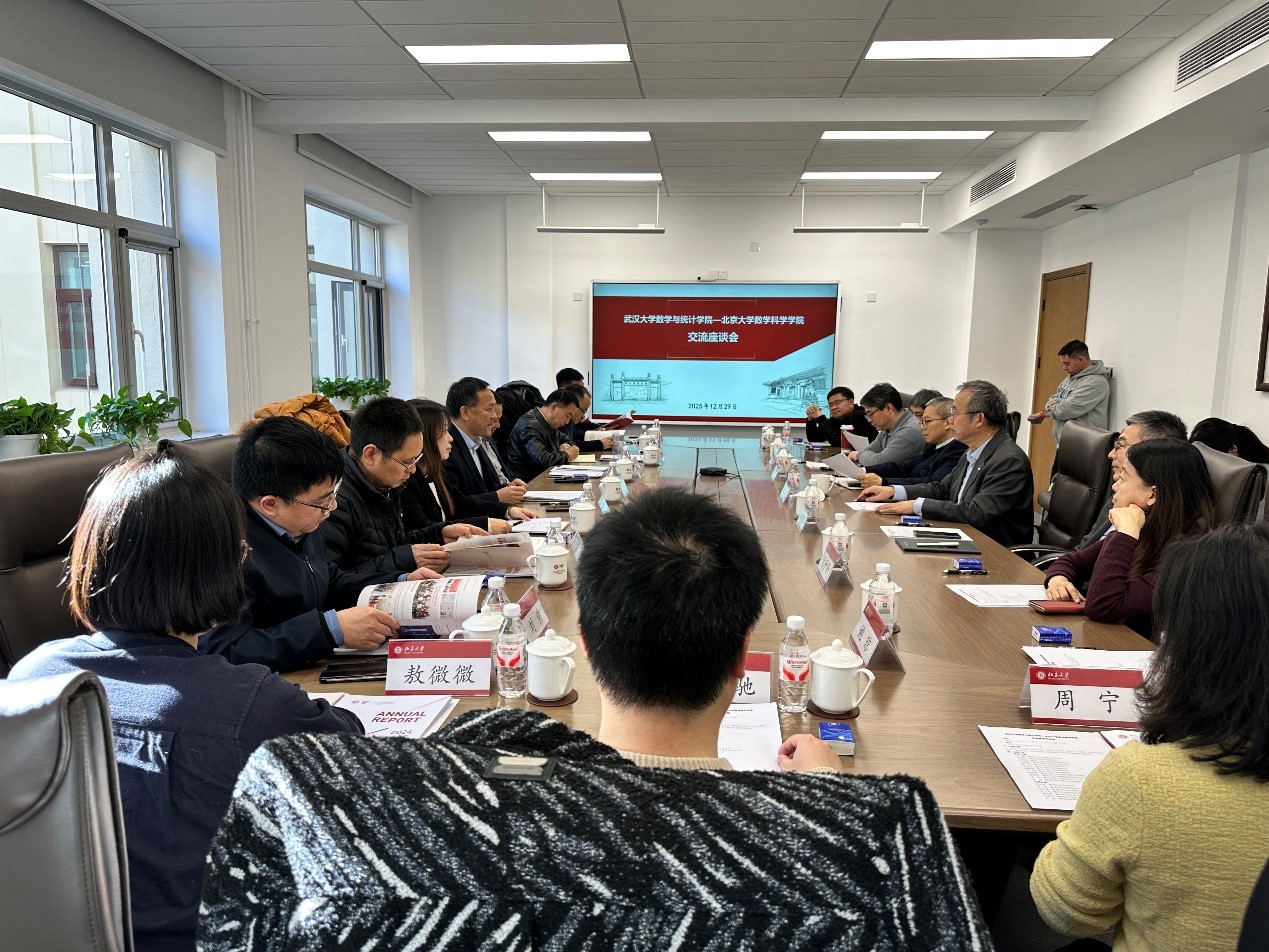 12�29日下午,代表团首先赴北京大学数学科学学院开展调研。北大数学科学学院院长陈大岳、党委书记胡俊等领导班子成员出席会议。座谈会上,双方围绕“十五五”规划编制思路、课程体系优化、拔尖人才培养模式、绩效考核评价体系等关键问题进行了全面深入的探讨。北大数学科学学院分享了其在学科建设、人才培养等方面的宝贵经验与成功做法,为我院相关工作的开展提供了重要借鉴。会后,代表团参观了北京大学智华楼,实地学习了北大数学科学学院在软硬件文化建设、学术交流平台搭建等方面的先进经验与实践成果。范辉军期待与北大数学科学学院深化合作、携手共进,建立常态化交流联系机制,推动双方合作走深走实�