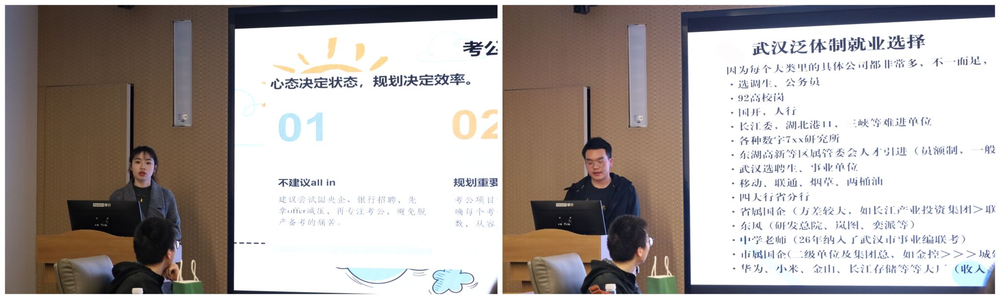 考公选调方向,邱书逸同学系统梳理考公全流程备考策略,围绕整体规划、笔试模块答题技巧、面试备战方法、岗位报考核心建议等内容细致讲解,并贴心提醒同学们切勿完全脱产备考,可同步投递国央企、银行等岗位,合理缓解求职压力。李一行同学则深耕武汉地区泛体制内就业,详细解读选调生、选聘生、央国企等岗位考情政策与报考要求,建议同学们密切关注本地时政热点,主动将统计专业优势与地方发展需求精准对接,提升报考适配度。