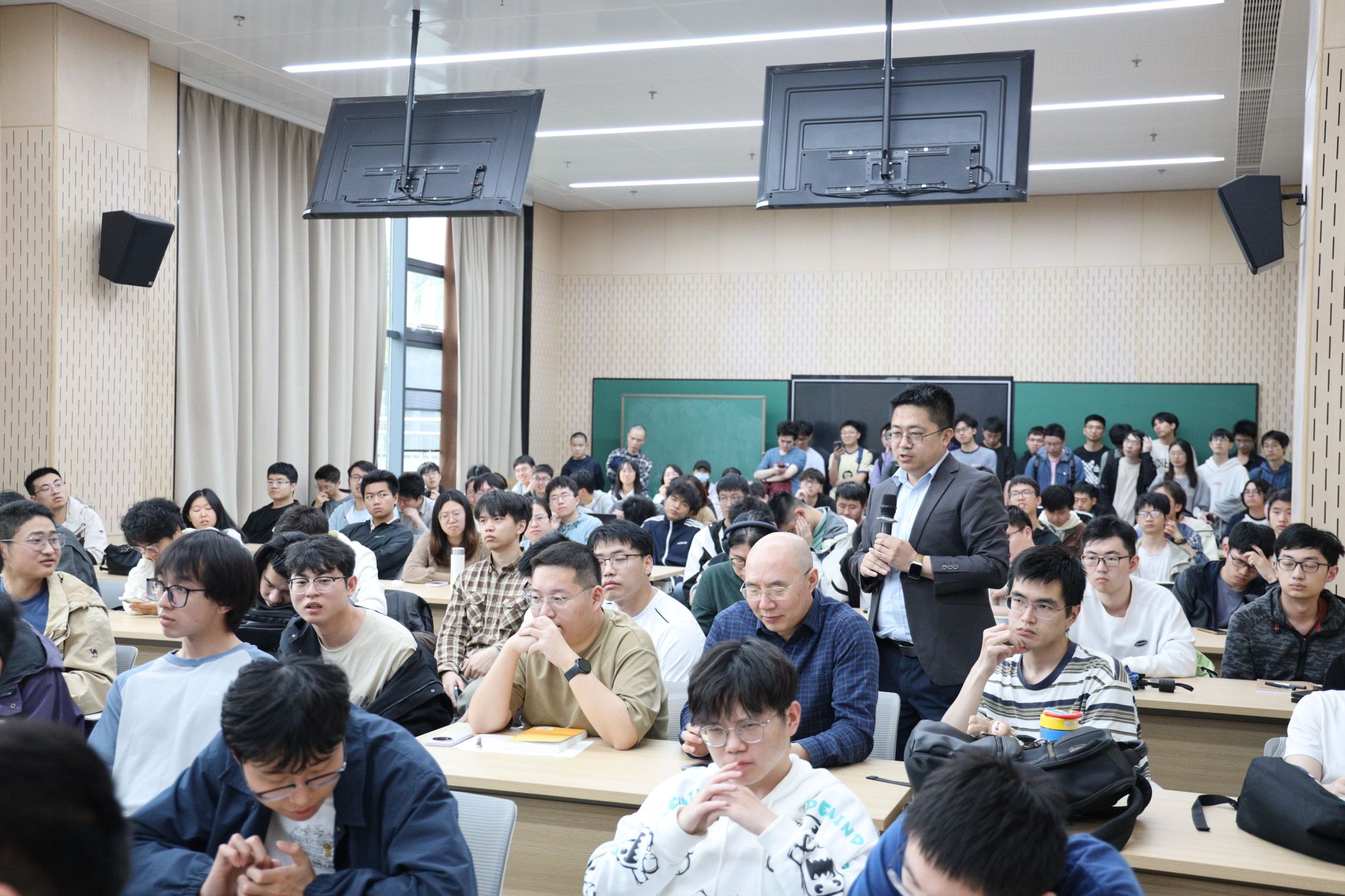 报告厅内座无虚席,师生们凝神倾听。张益唐教授系统梳理了素数分布的研究脉络。他从欧几里得证明素数无穷多的经典方法谈起,回顾了从黎曼ζ函数到狄利克雷L函数的理论演进,进而引出朗道-西格尔零点问题。在报告中,张益唐教授结合自身在孪生素数猜想研究中2013年突破“7000万鸿沟”的宝贵经验,提出了一种解决该问题的潜在方法。报告内容深入浅出,提升了师生对素数分布研究前沿的理解与认知。