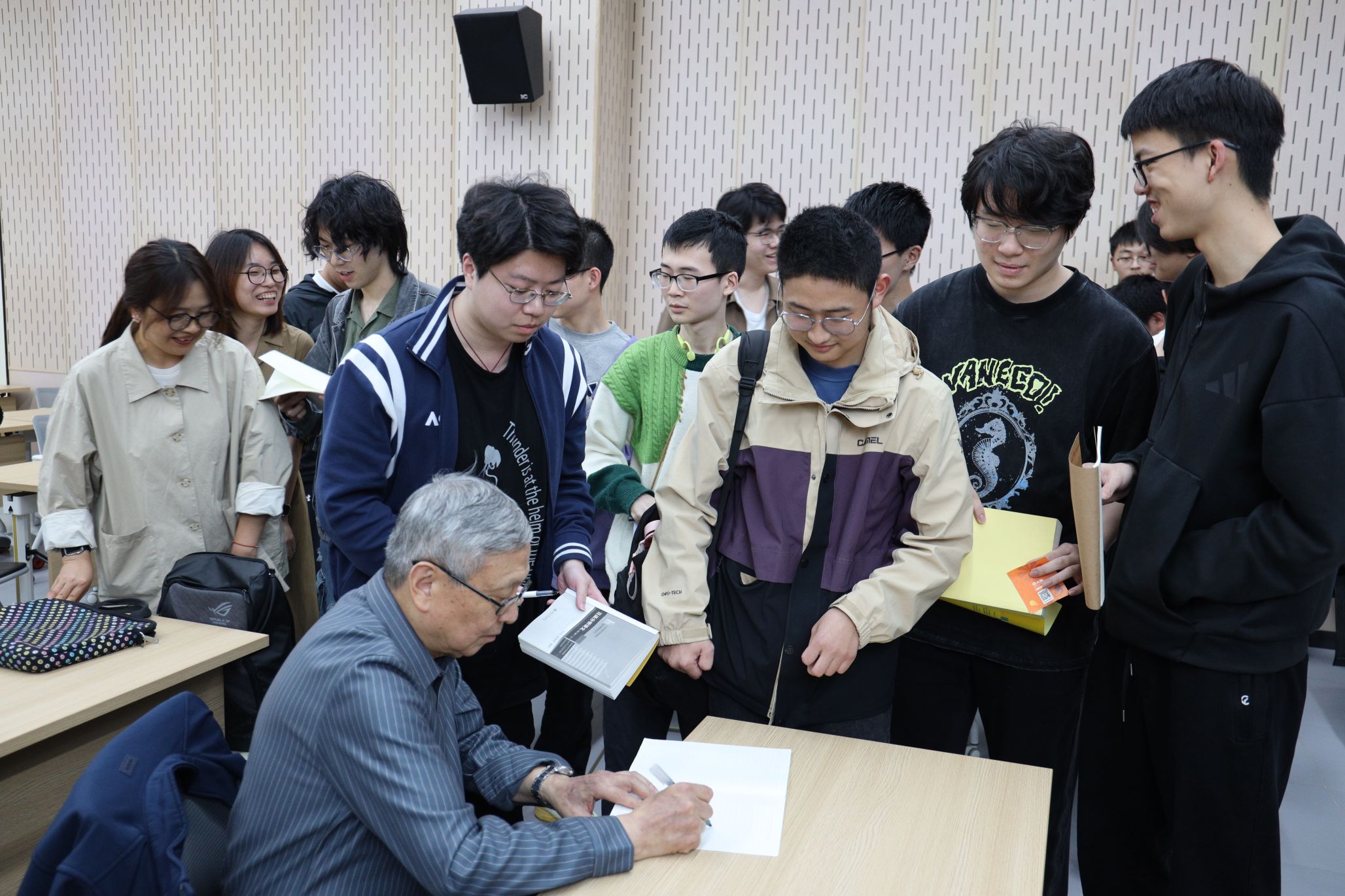 报告结束后,张益唐教授与现场师生进行了热烈的交流互动。结合自身传奇经历,他勉励学子要怀揣笃定信念与平常心,心无旁骛地追求理想,切莫遗失最初的赤诚,坚信从容深耕定能抵达超乎想象的高度。针对“朗道-西格尔零点猜想”的提问,张教授以开阔视野回应,无论猜想证伪还是证实,都将我们引向蕴含独特价值的不同“宇宙”,鼓励大家即便期待破灭也不必气馁,未来始终充满探索可能。现场师生纷纷与张教授交流并合影留念。本次活动不仅为师生带来了前沿的学术思考,更传递了坚守理想、从容豁达的人生智慧。