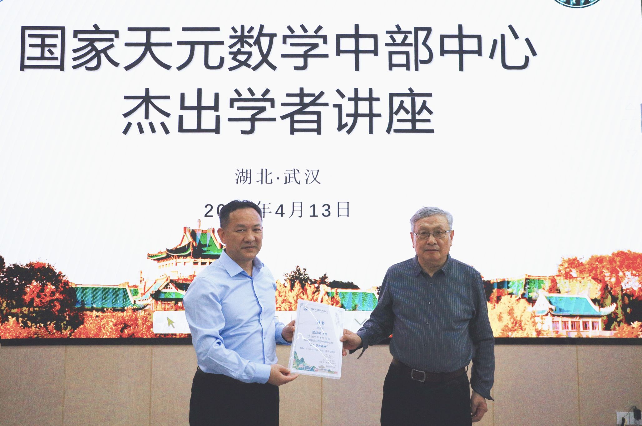 院长、国家天元数学中部中心执行委员会主任范辉军教授主持讲座,并为张益唐教授颁发了国家天元数学中部中心杰出学者讲座纪念牌。