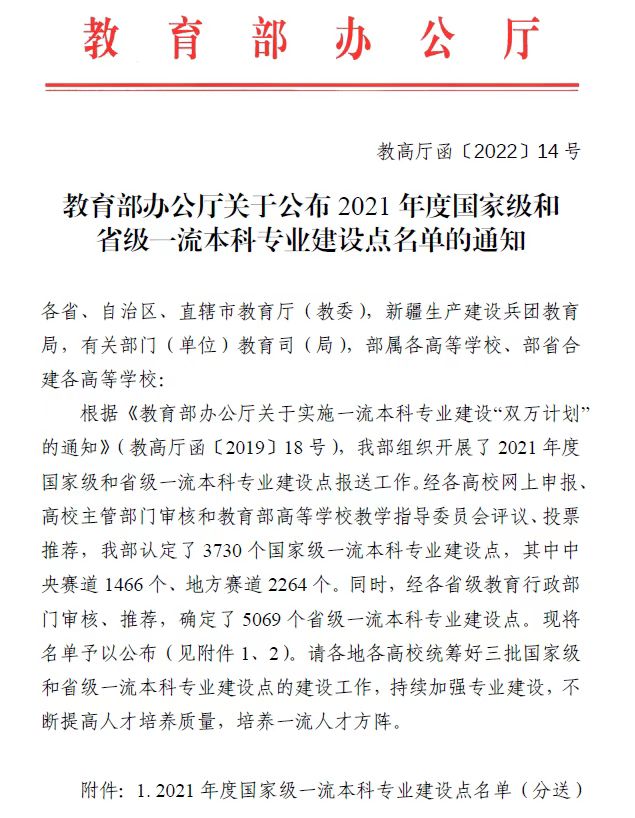 近日,教育部下发《教育部办公厅关于公布2021年度国家级和省级一流本科专业建设点名单的通知》(教高厅函〔2022〕14号),笔趣阁app