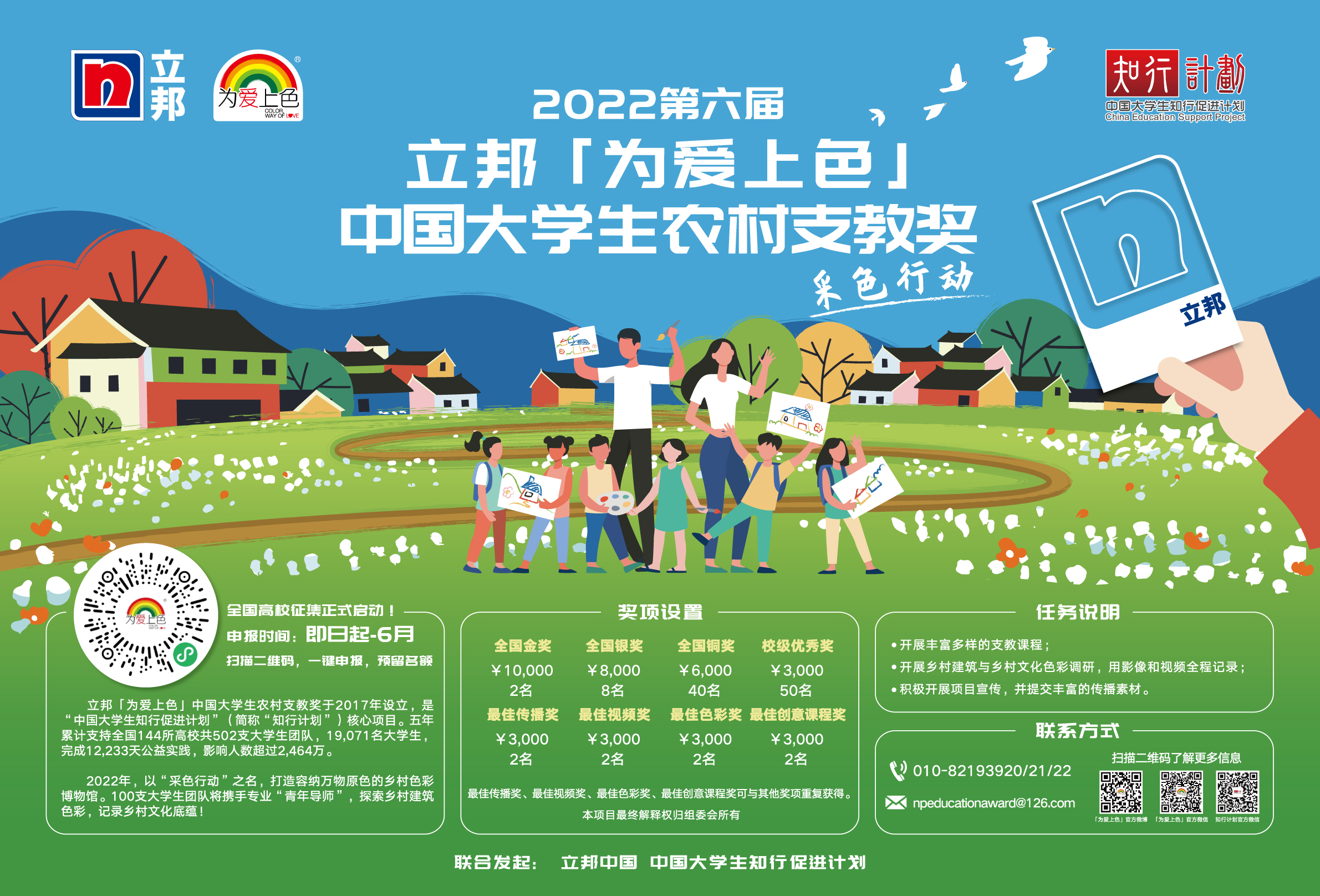 据悉,立邦「为爱上色」中国大学生农村支教奖于2017年设立,是团中央学校部“中国大学生知行促进计划”中的核心项目,五年累计支持全国144所高校�502支大学生团队�19071名大学生,完�12233天公益实践,影响人数超过2464万�第六届中国大学生农村支教奖共吸引164所高校�323支大学生团队申报�共计评�2个全国金奖�8个全国银奖�40个全国铜奖�“学习邦”支教队是我校入围上述奖项的唯一团队�