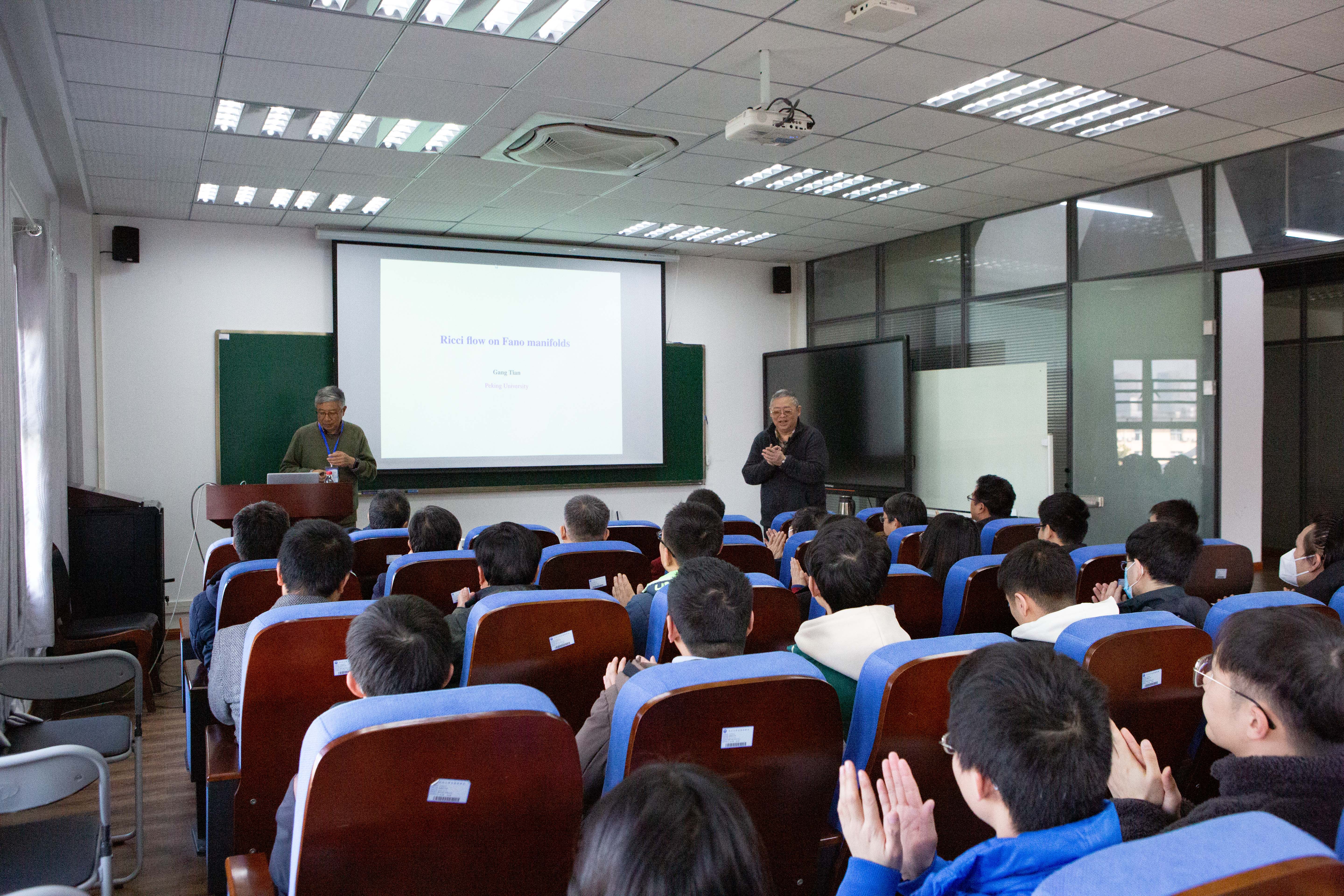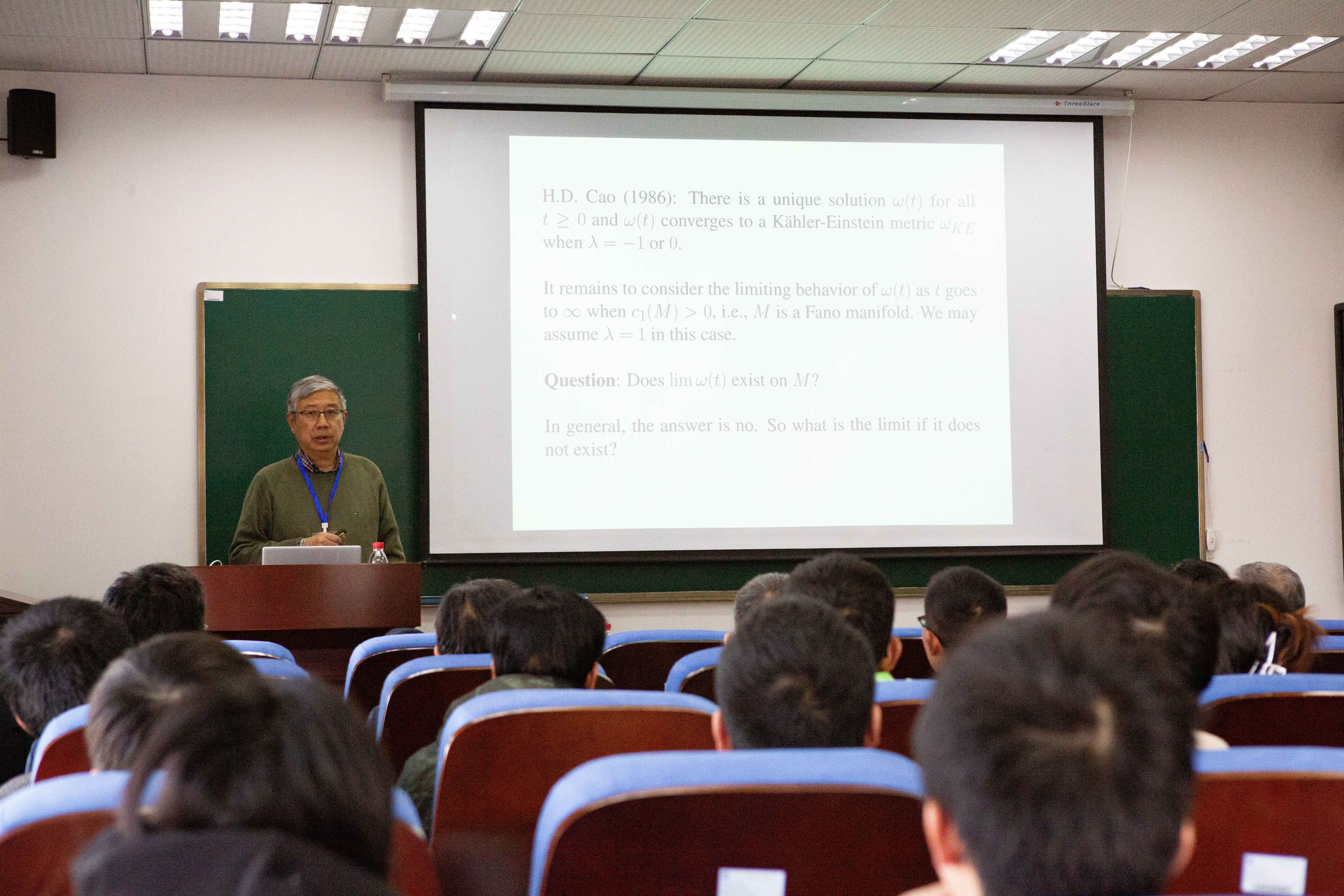 田刚院士首先介绍了Ricci流的定义。Ricci流最初是Hamilton引入的,并发展了许多重要理论,最终被Perelman作为强有力的工具用于解决庞加莱猜想。田刚院士阐述了Fano流形上Ricci流解的极限存在性问题,在此方向上做出重要贡献的有Perelman、田刚、朱小华、Dervan、Szekelyhidi、张旗等著名的几何学家。然后田老师介绍了自己曾利用K-稳定性证明某种Fano 3-流形M上既不存在任何Kaehler-Einstein度量,也不存在Kaehler-Ricci孤立子,从而Kaehler-Ricci流w(t)在M上没有极限,以及他与合作者在此方向上的重要进展。在报告的后半段,田刚院士主要介绍了著名的Hamilton-Tian猜想,在3维情形,该猜想已被田刚与张振雷解决,高维情形则被Bamler和Chen-Wang解决。随后,田刚院士提出了收敛极限的正则性与解的收敛性以及Type II解的存在性问题,他详细介绍了在2维情形没有Type II解但高维情形存在Type II解,以及自己与合作者的最新研究成果,发现了某类具体流形以及一族3维Fano流形上的Kaehler-Ricci流会产生Type II奇点。最后,田刚院士向与会学者和研究生提出了有待进一步研究的问题,鼓励青年学者深入研究,勇攀高峰。