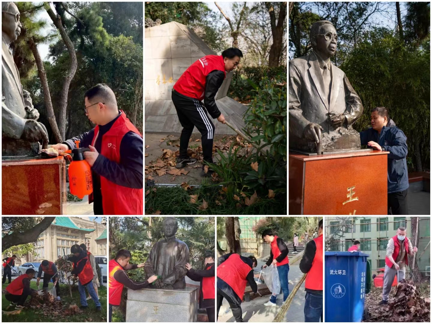 樱顶老图书馆门前,伴随着晨曦与鸟鸣,师生分为五组清扫了樱园各个片区地面与草坪上的落叶及树枝、擦拭了王世杰、王星拱、闻一多、李国平等大师先辈雕像上的灰尘并清理了周边的杂草�