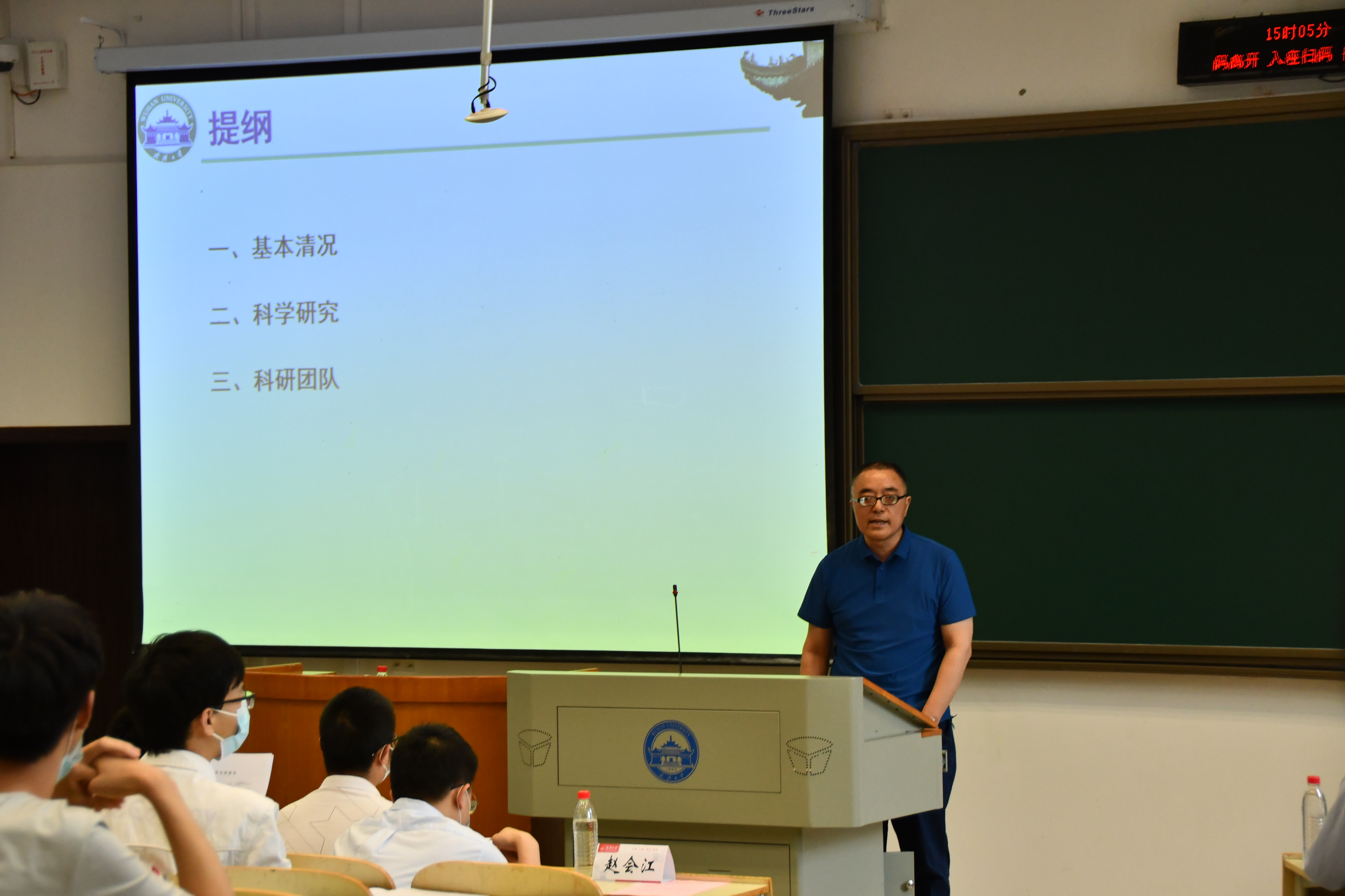 2022�5�26日下午,数学�2023届毕业生学业指导大会暨遴选优秀本科生提前攻读本院研究生宣讲会在四教201教室召开。院长赵会江教授、党委副书记汪思明、副院长缪爽教授、基础数学�副主任刘会教�、应用数学系主任吴晓群教�、信息与计算科学�主任吕锡亮教�、概率与统计科学�副主任刘伟教授和各系教师代表、学工办的老师出席会议�2019级全体同学参加会议�院党委副书记黄安�主持会议�