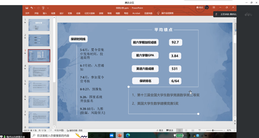 衣孝儒学长从自身经历出发,讲解了获得直博资格的过程,并强调数学分析与高等代数等专业课的重要性。最后,针对择校、择师的问题,学长希望同学们结合自身需求,做好取舍。