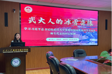 南北极科学考察队日常工作规范和工作环境,讨论国际治理以及我国南极领土权益保护问题。她结合极地科考的“苦”与“乐”,从吃、穿、住、行四个方面介绍南北极科学考察队日常生活,科考队员不畏艰险、勇于开拓的伟大精神让与会同志深受触动。最后,她立足于自身专业特色,与同学们探讨了极地法律环境与极地治理研究,介绍了国际治理、南极领土权益方面的内容。她号召大家用青春之姿践行极地科考精神,在秀美珞珈读懂极地科考、读懂青年人的责任担当,为实现中华民族伟大复兴贡献更多珞珈青春力量!