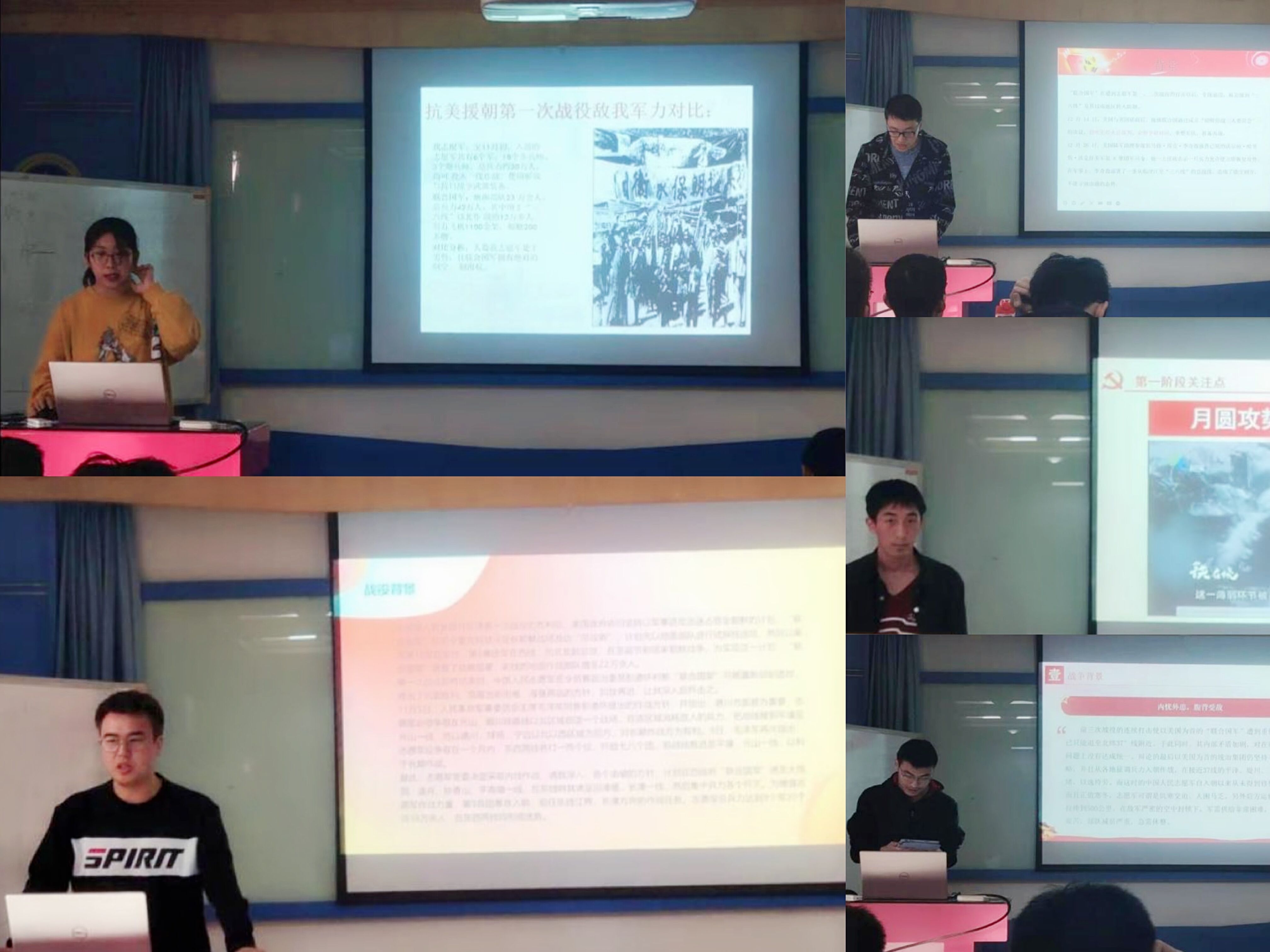 支部全体成员分成五组,依次介绍讲解抗美援朝战争中第一阶段的五次战役。同学们分别从战役背景、经过、基本策略、敌我对比、原因分析以及经验总结等多维度对每一次战役进行了详细的讲解,大家通过展示前的准备以及其他组同学的展示对抗美援朝战争中的重要战役有了更加深刻的了解�