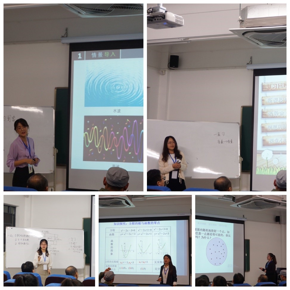 在每组讲课结束后,针对每位选手的表现,三位评委老师分别进行点评。贺老师提出了以下一些建议:一是讲课时要合理有效地利用课件,不仅可以节省时间,而且可以让学生更直观地理解知识;二是讲课时应避免语速过快,注意讲课的节奏;三是讲解定义时应当把握中学生的思路,可以从特殊示例引出一般定义;四是讲课时应注意例题不宜过多,选取典型的一两个题目即可。