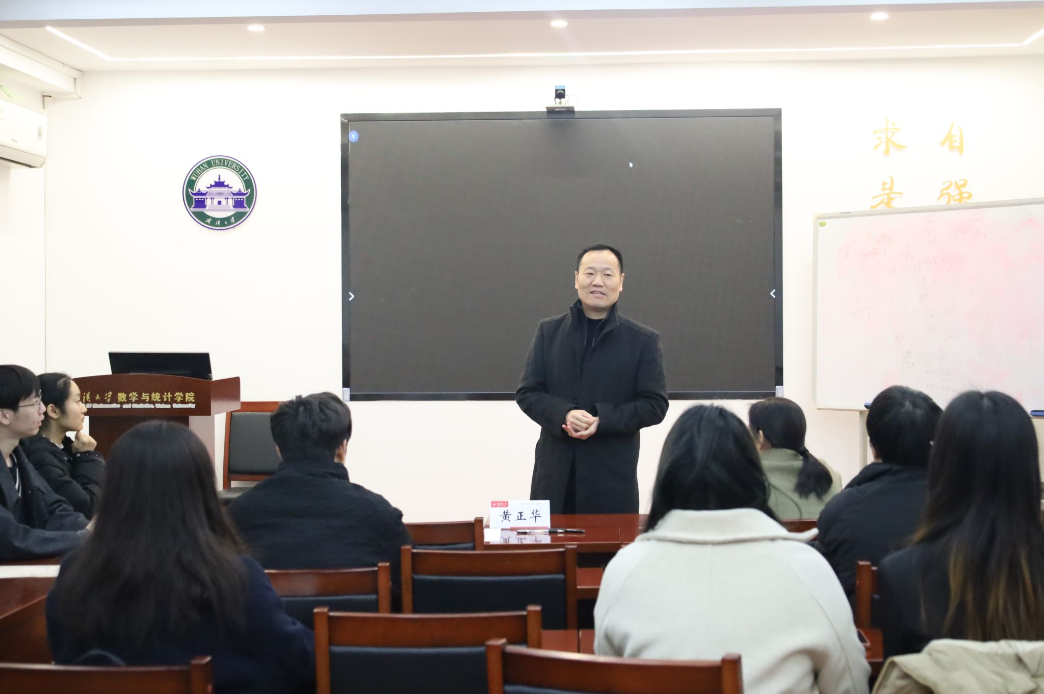 黄正华老师在致辞中充分肯定了研究生数学讲课比赛的重要意义,并为有志从事教育教学的研究生提出了三点建议:一是积极探索,大胆创新;二是以赛促学,以学促用;三是立德树人,培根铸魂。最后,他表达了对参赛选手们的期待,希望选手们在比赛中享受舞台,赛出成绩和风采�