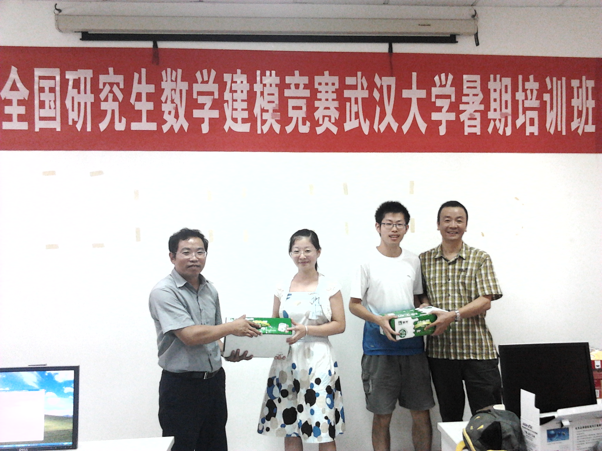 最后,由朱部长、张书记分别代表研究生工作部、学院向参加培训班的研究生代表授予慰问品。慰问活动在欢乐融洽的气氛中圆满结束,培训班的30名成员将在9月中下旬参加第九届“华为杯”全国研究生数学建模竞赛。(沈鹏飞)