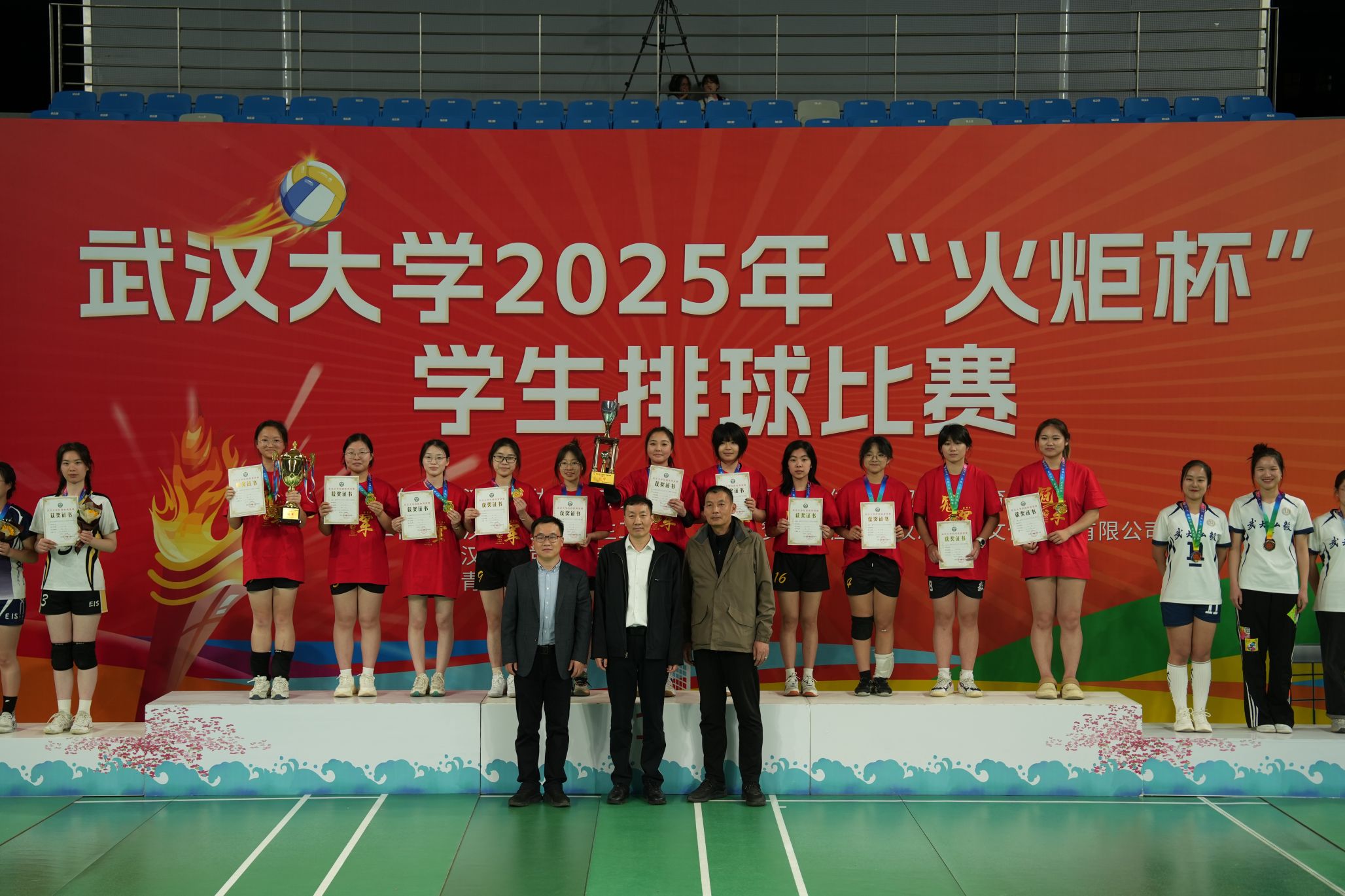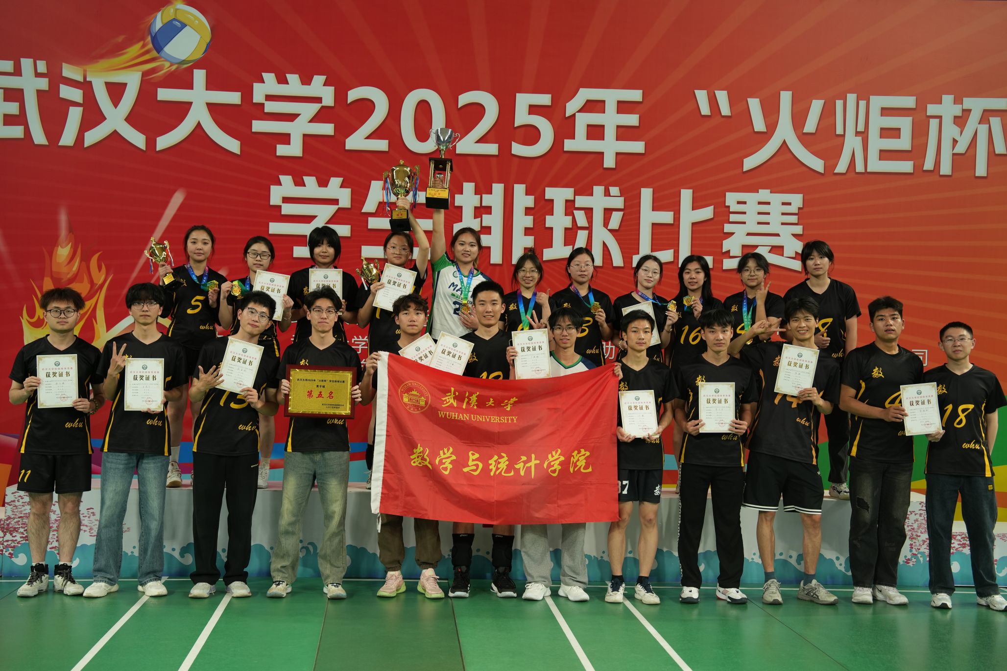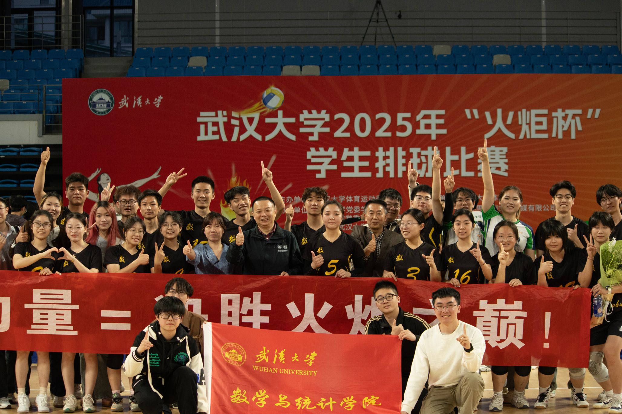 On the afternoon of April 3rd, the finals of Wuhan University's 2025 "Huo Ju Cup" Student Volleyball Tournament commenced grandly at Zhuoer Gymnasium. After days of intense competition, our school's women's volleyball team delivered an outstanding performance to claim the championship, successfully defending their title. Team member Huang Jing was honored as the “Most Valuable Player,” while Li Jiayue was recognized as the “Best Middle Blocker.” The men's volleyball team fought valiantly to secure fifth place, marking a significant improvement over last year's seventh-place finish. Vice President Song Baoliang and leaders from the university's administrative departments attended the event and presented awards to the winning teams and players. Li Qin, Secretary of the Party Committee of our college, along with Deputy Secretaries Wang Siming and Liu Shanshan, were also present to cheer on the players.